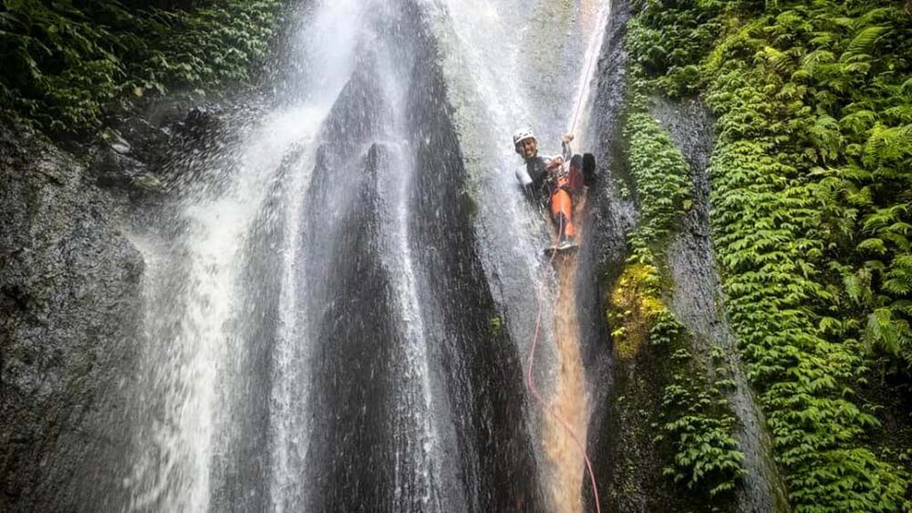 If you have to choose only one sporty canyon with water in Bali, Kerenkali would be perfect. Located in the north of Bali, Kerenkali is practicable throughout the year. It has 2 single parts: the first one is a sequence of jumps, water slides, short rappels with gorges made of volcanic rock, caves and tuff, sulfur water basin coming out from the underground, a mix of fun and exploration for esthetic and thrills pleasure. The second part, sportier, enchanting rappel descents along waterfall (the highest is 26m), swim, jump up to 10m (optional), floating, Balinese lunch at mid-day of the canyon. Kerenkali is a good choice for the beginners. Fun – adrenaline rush – rich in colours and magic landscapes all along your descent, ever after. 18 year of age is the minimum age.