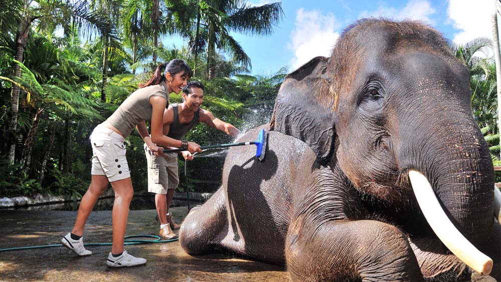 Reserve your exclusive opportunity to wash, bathe and ride bareback atop our elephants as they romp and play, splash and dunk in their bathing lake, one of their favorite rituals of the day.