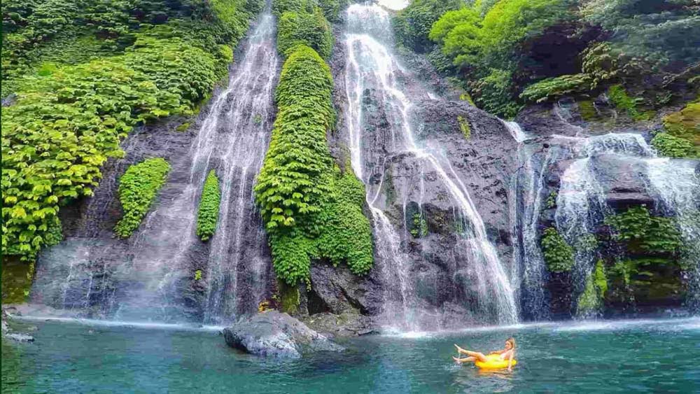 One of the lesser known waterfalls in Bali. It is located north of Lake Buyan in northcentral Bali. Unlike many trails this is a completely natural trail and rarely hiked trail. Just past the waterfall is a water curtain of various trickles of water down a wall of lush rocks. It is on the crater rim road between Munduk and the main highway from Singaraja to Denpasar. This is not an easy waterfall to find. There is a faded sign leading down a small rural road away from Lake Buyan.