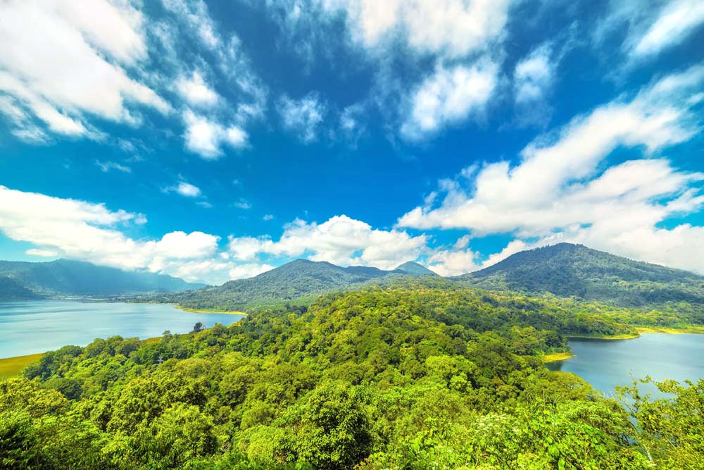 There is an enormous panoramic stone platform, open to the public, from which you can admire the spectacular Twin Lake View, caressed by the fresh mountain air in between the blue lake waters and lush verdant forest. It is located in Munduk, in the north of Bali, where the “twin lakes” Buyan and Tamblingan meet in a caldera, formed after a volcanic eruption thousands of years ago, creating a unique naturalistic panorama. Until 1800, the two lakes were united, but because of a landslide, they were separated by a natural land-bridge covered by rainforest.