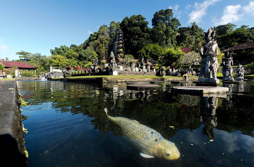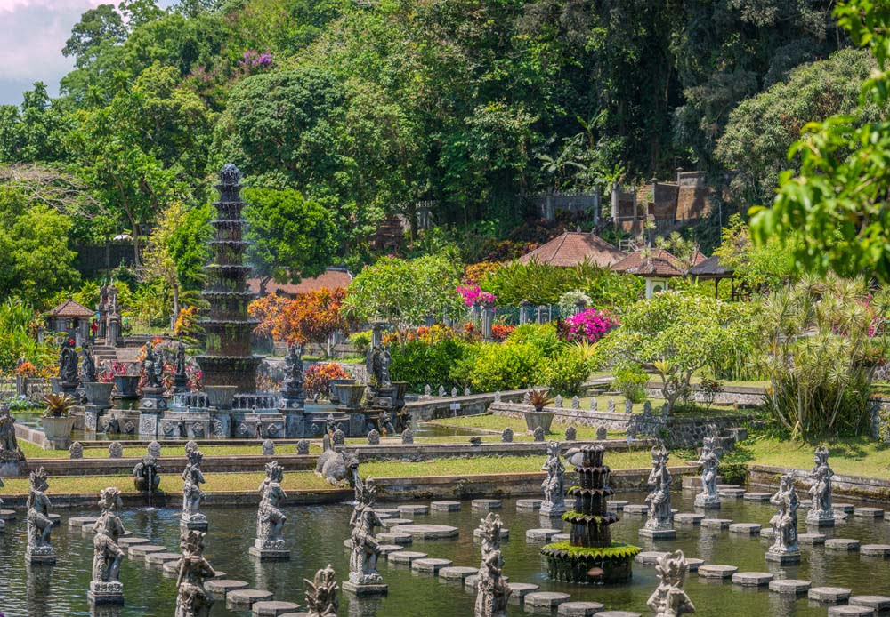 A former royal palace ineastern Bali, Indonesia, about 5 kilometres from Karangasem, near Abang. It is noted for its water palace, owned by Karangasem Royal. Tirta Gangga literally means water from the Ganges and it is a site of some reverence for the Hindu Balinese. Tirta Gangga water palace is a maze of pools and fountains surrounded by a lush garden and stone carvings and statues The centrepiece of the palace is an eleven tiered fountain and there are many beautiful carvings and statues adorning the gardens.