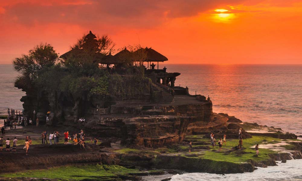 Located in coastal side of Beraban countryside, Kediri, Tabanan. The temple is built on the rock with 3 acre size and reachable in a few minutes walk. This temple is very famous among tourist destinations in Bali with spectacular view of sunset. At some nooks of coral reef around Tanah Lot Temple, there is holy snake of which colour is black and white which according to the local society, it is believed that is a diety property and the guard of the temple from the bad influence.